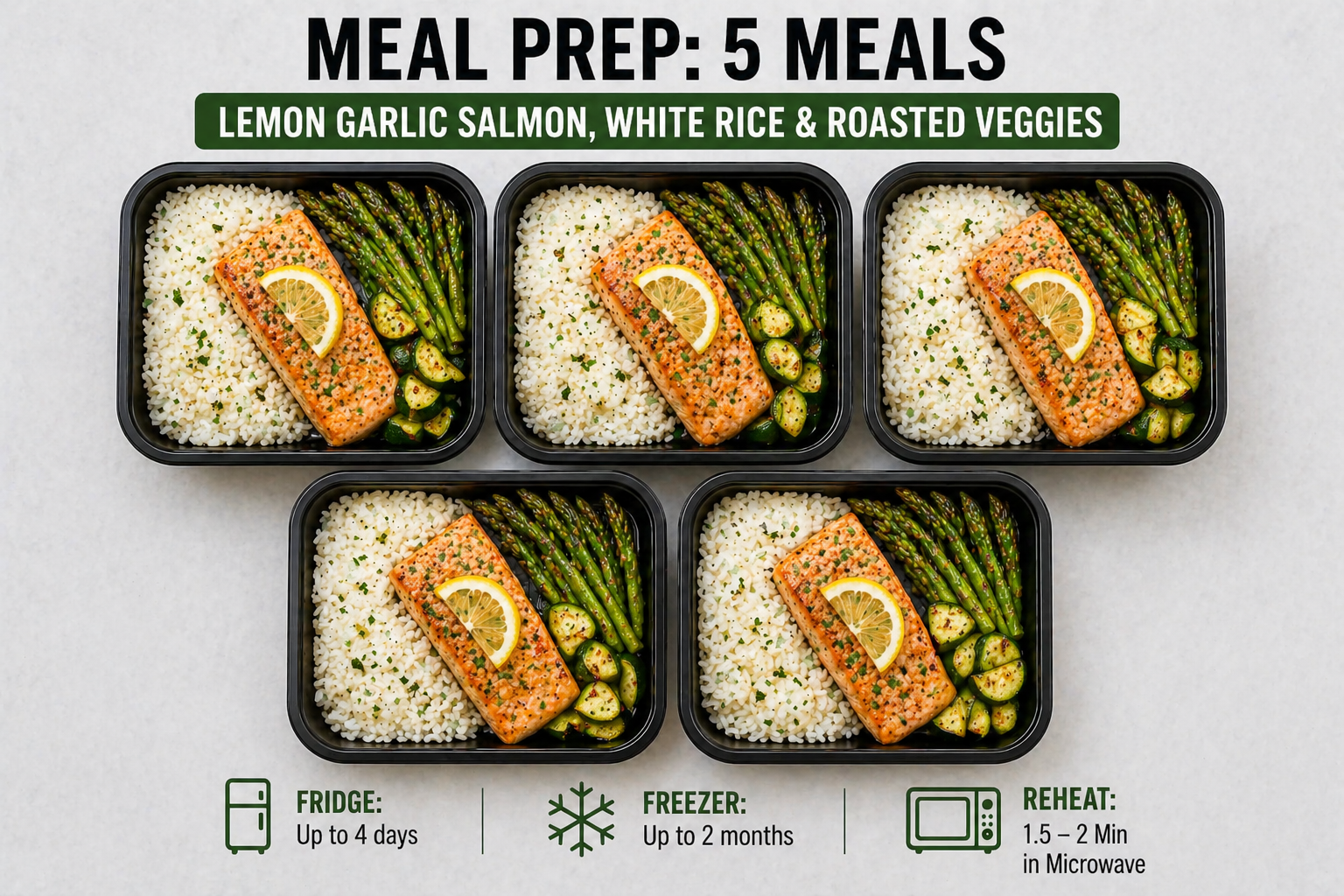 Salmon provides high-quality protein and healthy fats for recovery. Rice supplies steady energy. Vegetables add volume and nutrients for fullness. Controlled fats keep calories in check.